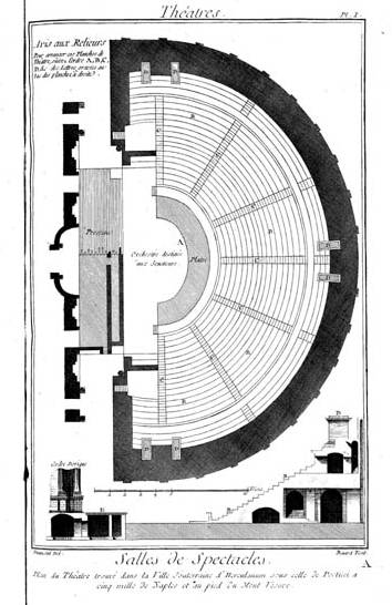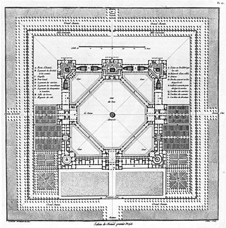 このような、いわばルソー的社会を理想とする彼にとって、人びとはなによりもまず平等であるべきなのはいうまでもない。ルドゥーは、そのテクストのいたるところで人びとの平等を強調し、また、ショーの第一次案から第二次案への移行---正方形プランから円形のそれへ---は、各建物、そしてそこで働く労働者の配置上のヒエラルキーを解消するためだとも説明している。(にもかかわらず、カウフマンは、この移行を幾何学のより強い自律性をルドゥーが求めたからだとした。それに対し、ヴィドラーは、フーコーに依拠しつつ、この第二次案を、ひとつは監視のヒエラルキーをつくりだす一種のディシプリナルな装置として、またひとつは労働を演劇的行為に転じるための古代劇場のアナロジー---《生産の劇場 theatre of production》として意図的な読み換えを行っている。)★9 だが、当時の社会を見渡すかぎり、そのような「自然」的な平等はどこにも見い出すことはできなかった。